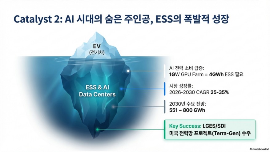 2026 2차전지 전망을 논할 때 절대 빠트려서는 안 될 것이 바로 ESS(에너지 저장 장치)입니다. AI 데이터센터의 전력 소비 급증은 ESS의 폭발적인 수요를 불러오고 있습니다.