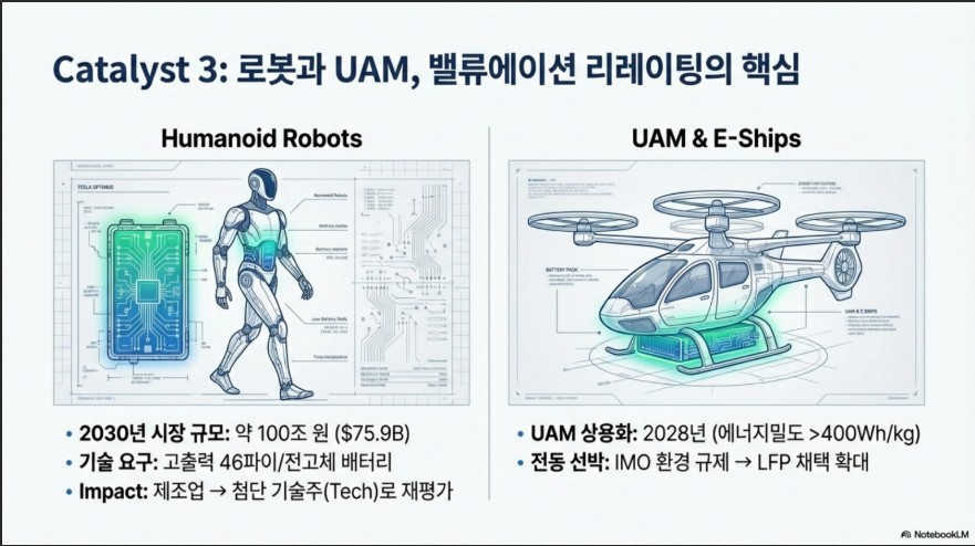 - 시장 규모: 2030년 로봇/UAM/선박용 배터리 시장만 약 100조 원($75.9B) 규모에 달할 전망입니다.