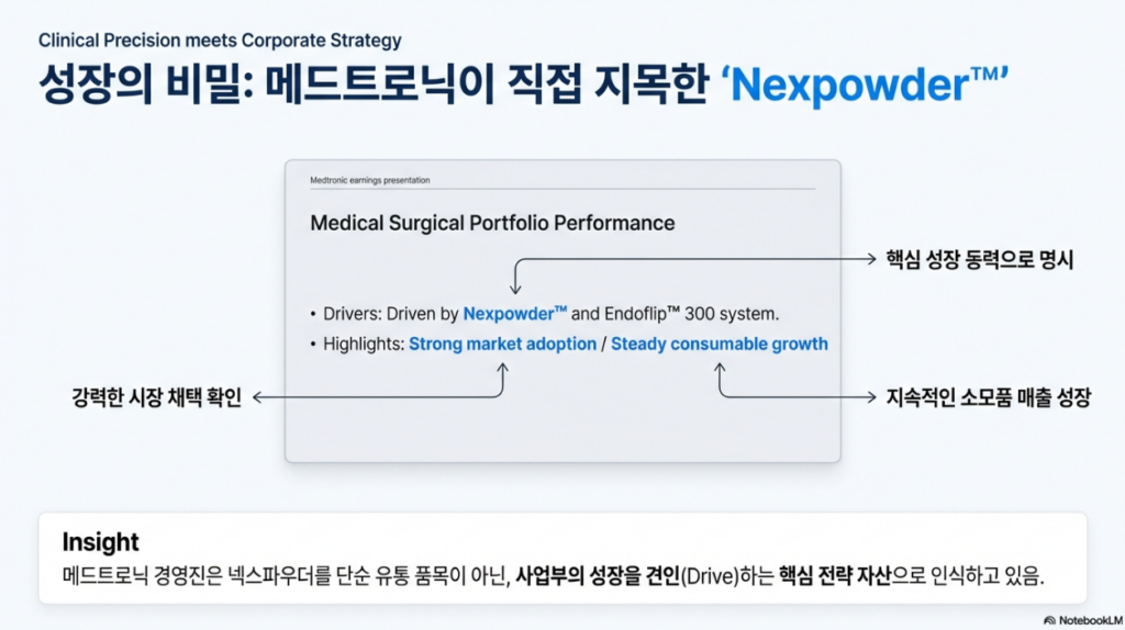 최근 GLP-1(비만 치료제) 열풍으로 인해 전 세계적으로 비만 대사 수술 건수가 감소하며 메드트로닉의 기존 수술 도구 부문은 역풍을 맞았습니다. 하지만 넥스트바이오메디컬의 넥스파우더는 이러한 구조적 위기를 상쇄하며 메드트로닉 내시경 사업부의 ‘성장 엔진’ 역할을 톡톡히 해내고 있습니다.