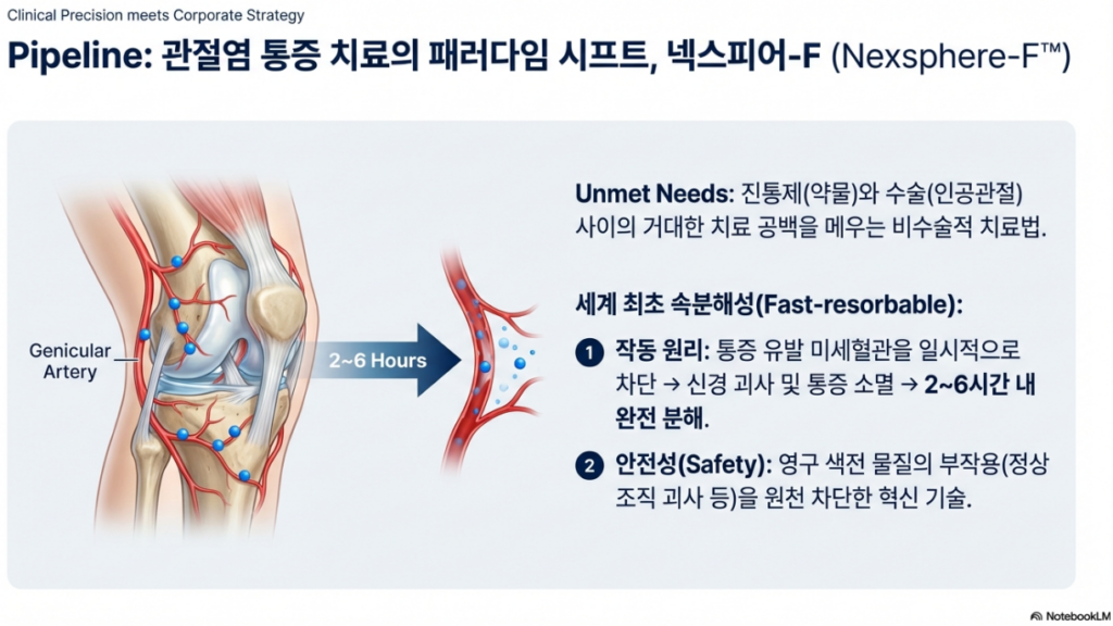 - 넥스피어-F FDA 승인 및 출시: 관절염 통증 치료의 새로운 표준(Standard of Care)으로 자리 잡으며 미국 시장에서 폭발적인 매출 성장이 예상됩니다.
