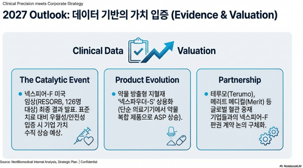 - 넥스피어-F 미국 임상(RESORB) 발표: 2027년은 기업 가치 재평가의 분수령입니다. 미국 FDA 허가를 위한 임상 데이터가 발표되는 시점으로, 우수한 안전성과 효능이 입증될 경우 주가는 새로운 국면을 맞이하게 됩니다.
