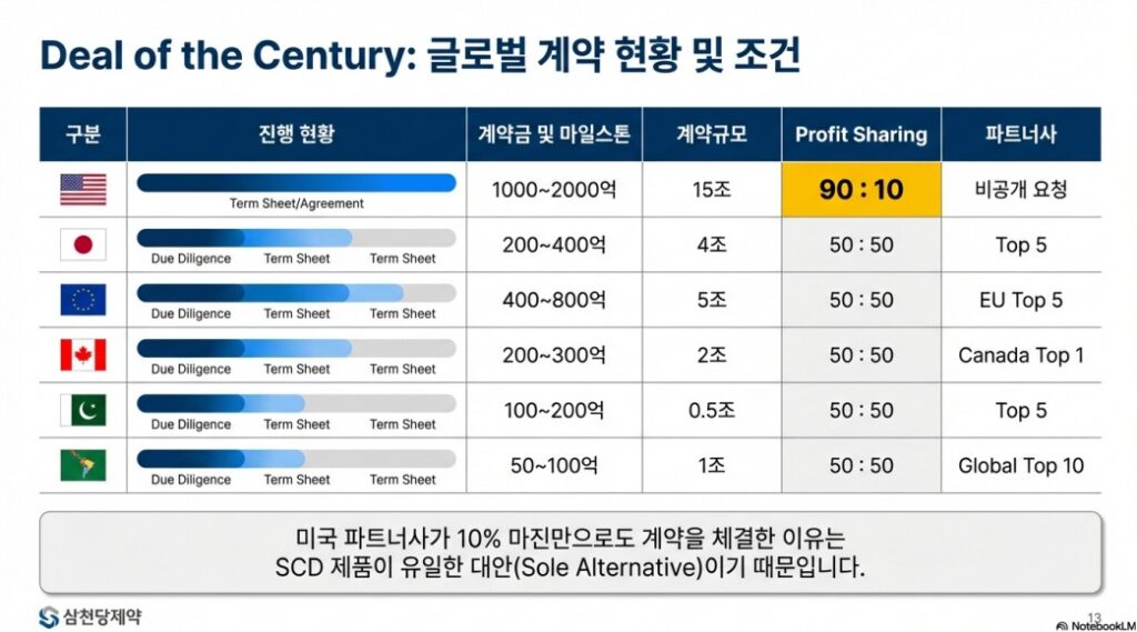 가장 놀라운 점은 미국 파트너사와의 계약 조건입니다. 현재 막바지 단계인 미국 본계약은 삼천당제약이 이익의 **90%**를 가져가는 구조로 논의되고 있습니다.
