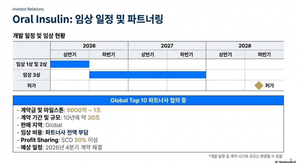 과거 오라메드(Oramed) 등 글로벌 경쟁사들이 흡수율 변동성을 통제하지 못해 임상에 실패했지만, 삼천당제약은 S-PASS 기술을 통해 주사제와 동등한 약동학(PK) 데이터를 확보했습니다. 현재 Global Top 10 제약사와 계약금 및 마일스톤 포함 최대 1조 원 규모의 기술이전 계약을 협의 중이며, 임상 비용 전액을 파트너사가 부담하는 유리한 조건입니다. 2026년 1분기 글로벌 IND 신청이 그 시작점이 될 것입니다.+2