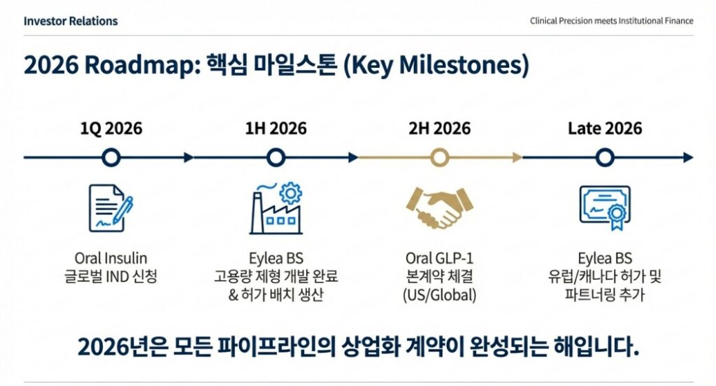 2026년 상반기, 경구용 인슐린의 글로벌 IND 신청과 아일리아 고용량 제형 개발 완료, 그리고 이어질 본계약 체결 소식들은 주가 상승의 강력한 촉매제(Catalyst)가 될 것입니다. 지금은 단순 제조업체 밸류에이션에서 글로벌 플랫폼 기업의 밸류에이션으로 재평가(Re-rating)를 준비해야 할 시점입니다.