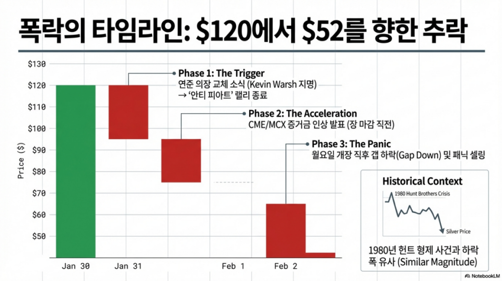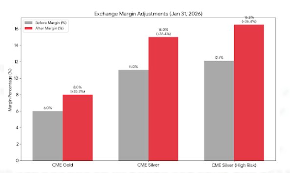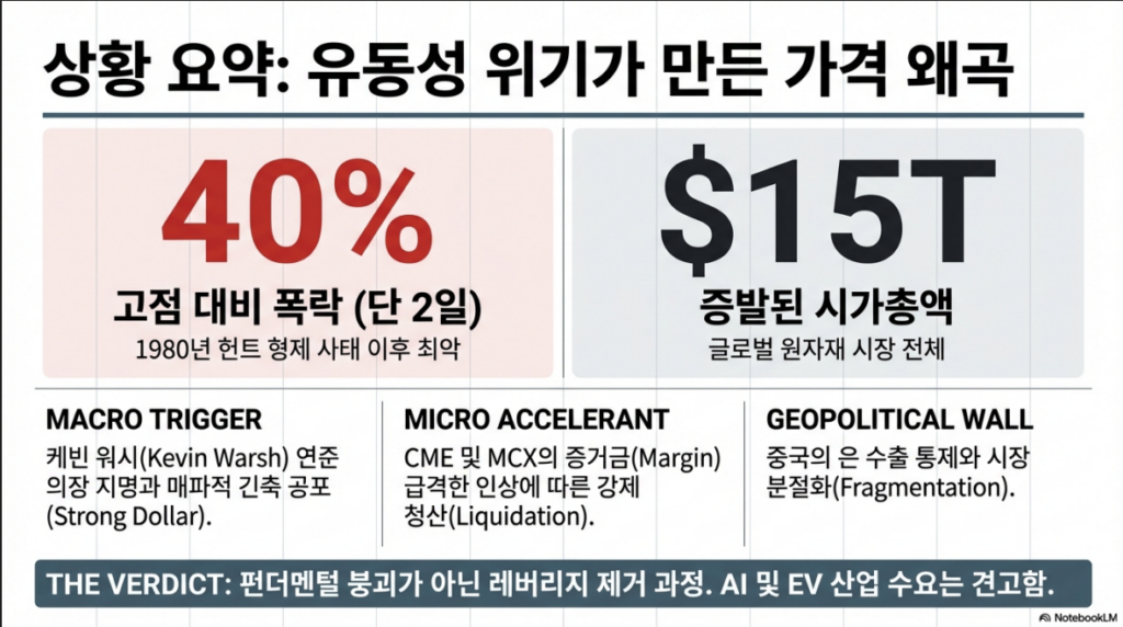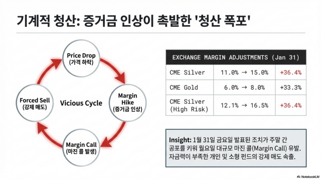 CME와 MCX 등 주요 거래소의 급격한 증거금 인상은 투매를 가속화했습니다. 특히 주말 직전 발표된 조치는 월요일 개장과 동시에 대규모 마진 콜(Margin Call)과 강제 매도를 유발했습니다.