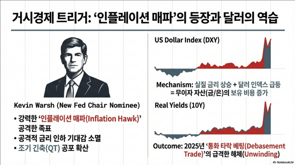 신임 연준 의장으로 지명된 케빈 워시(Kevin Warsh)의 등장은 시장의 분위기를 완전히 바꿔놓았습니다. 강력한 ‘인플레이션 매파’인 그의 성향은 금리 인하 기대감을 소멸시켰고, 달러 가치 급등을 유발하여 은과 같은 무이자 자산의 보유 비용을 높였습니다.