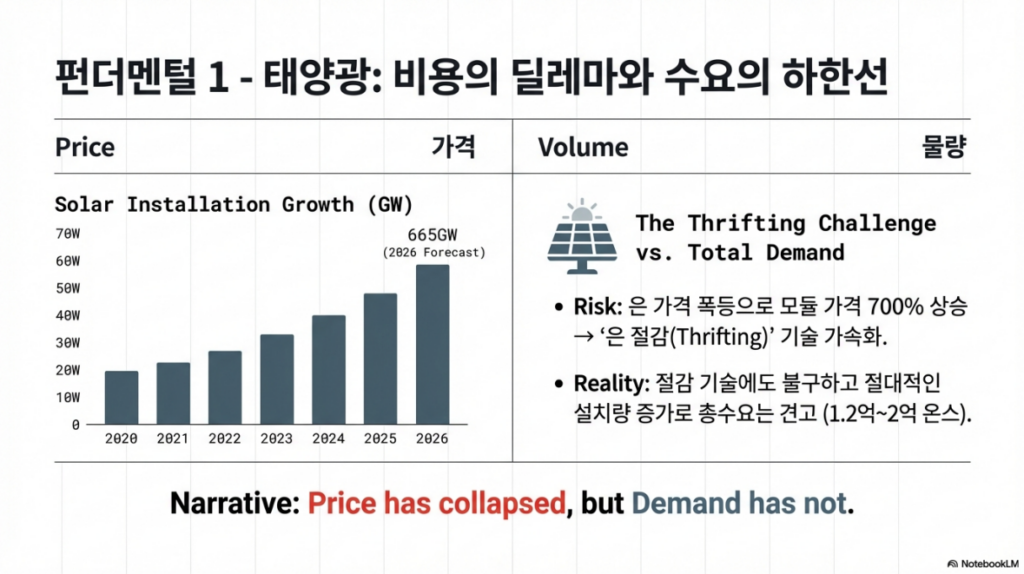 - 태양광 산업: 2026년 설치량은 665GW로 사상 최고치를 경신할 전망이며, 은 절감 기술 도입에도 불구하고 절대적인 사용량은 줄지 않고 있습니다.