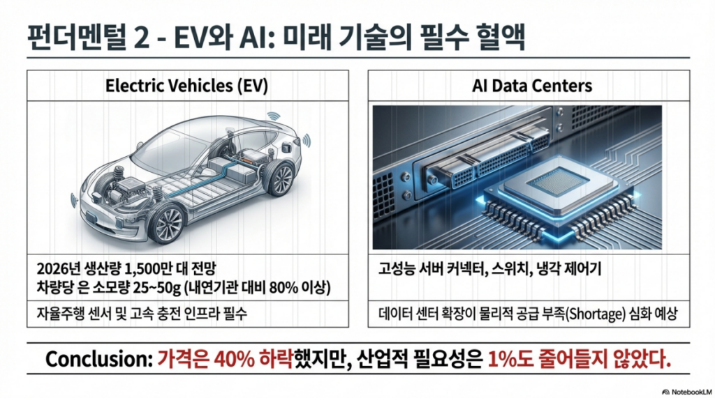 - 전기차(EV) 및 AI: EV 1대당 은 소모량은 내연기관 대비 80% 이상 많으며, AI 데이터 센터 확장에 필요한 고성능 커넥터 수요는 물리적 공급 부족(Shortage)을 심화시키고 있습니다.
